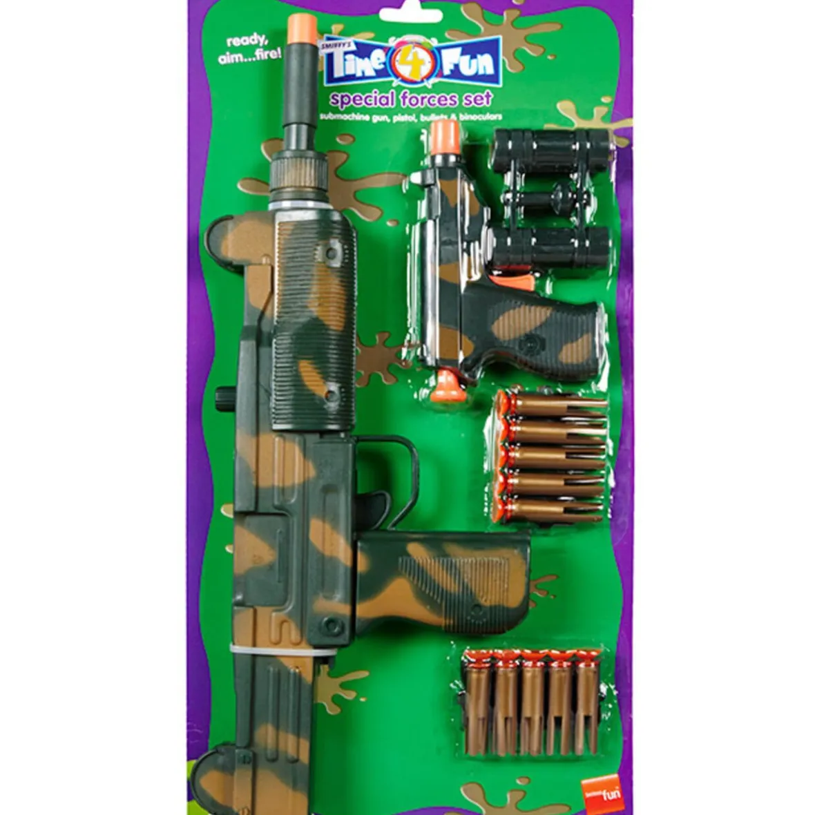 Set de l’armée kaki comprenant une mitraillette (longueur 45 cm), un pistolet, des munitions (fléchettes), une paire de jumelles. En plastique. Dès 3 ans.