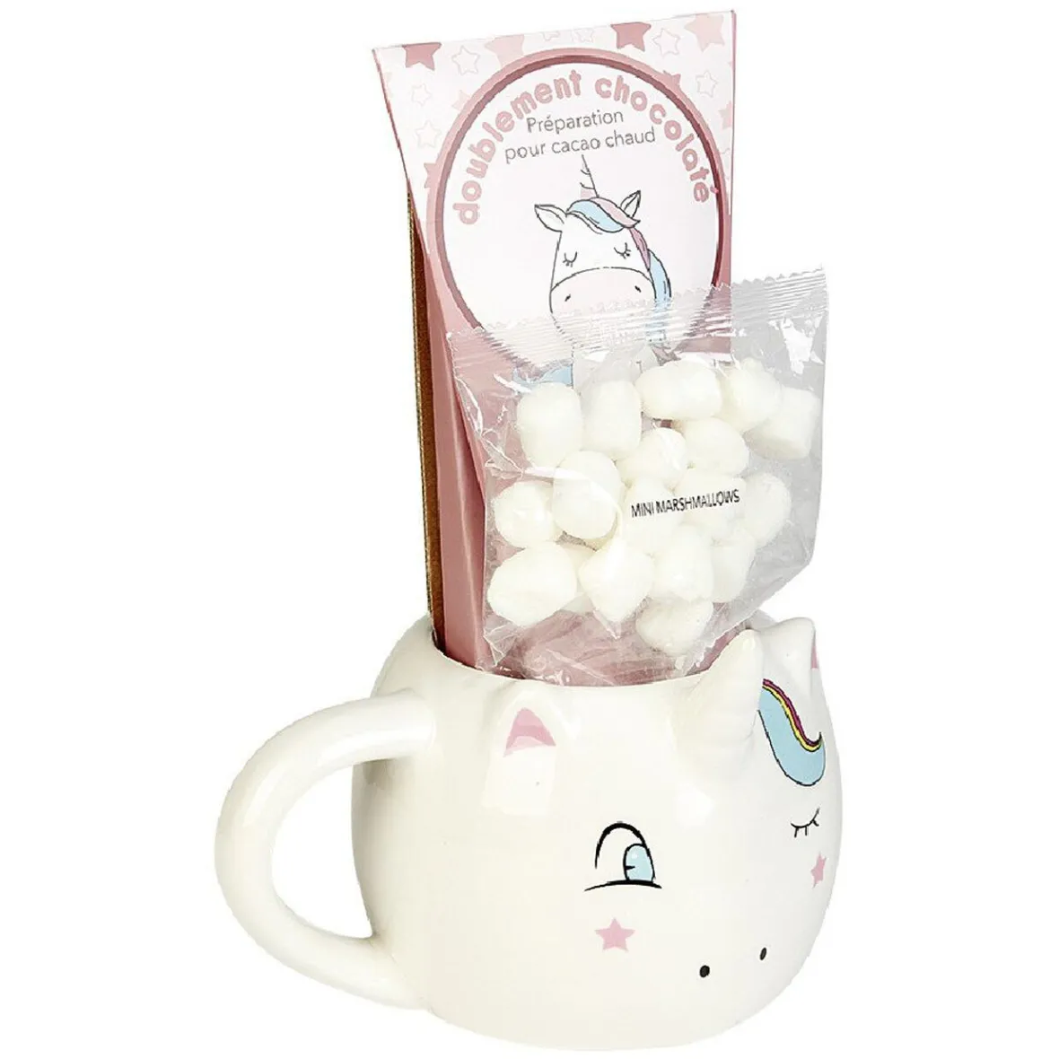 Mug tête de licorne avec préparation pour chocolat chaud et sachet de chamallows