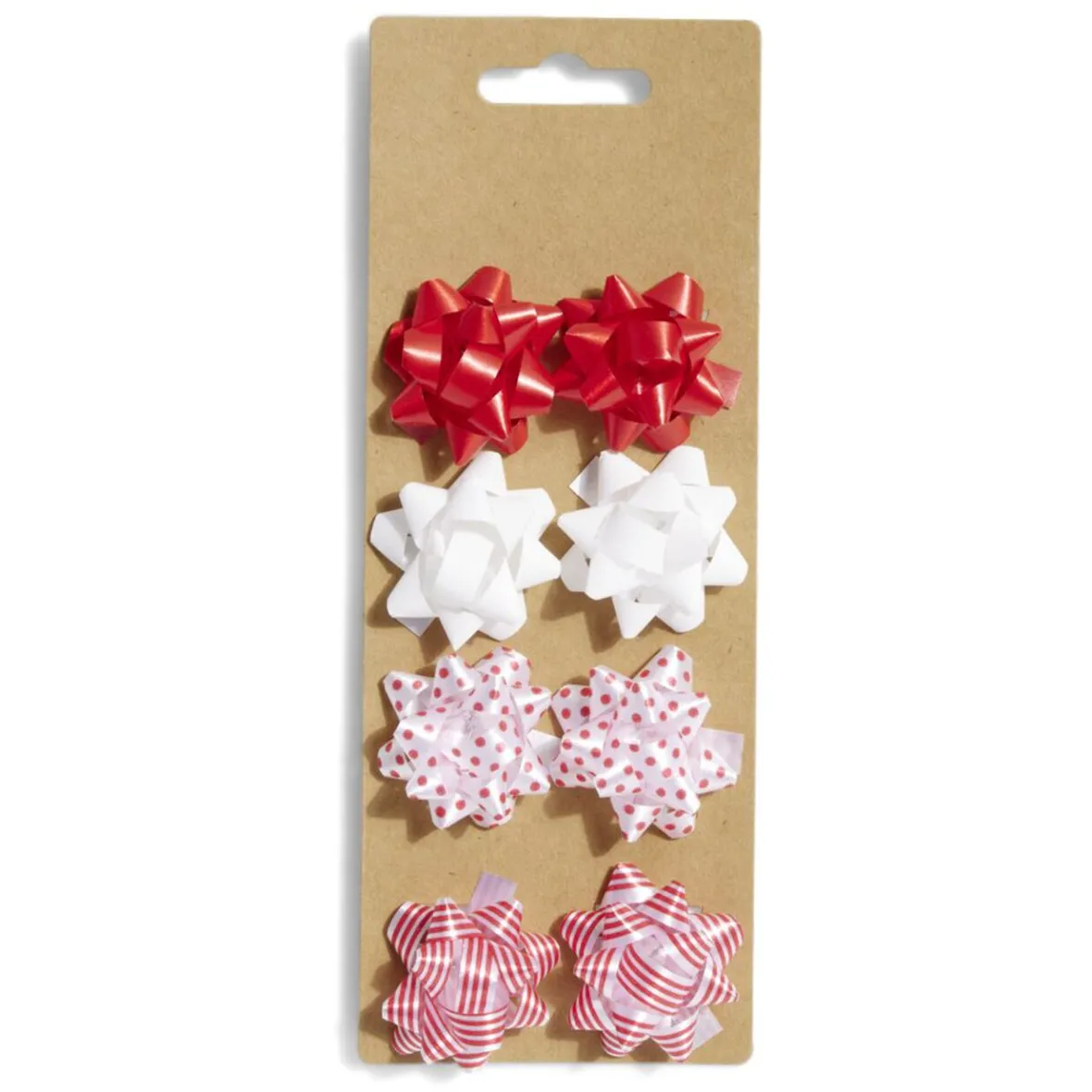Ce lot de 8 noeuds mats et brillants en bolduc rouge et blanc est indispensable pour parfaire vos emballages cadeaux de Noël.
