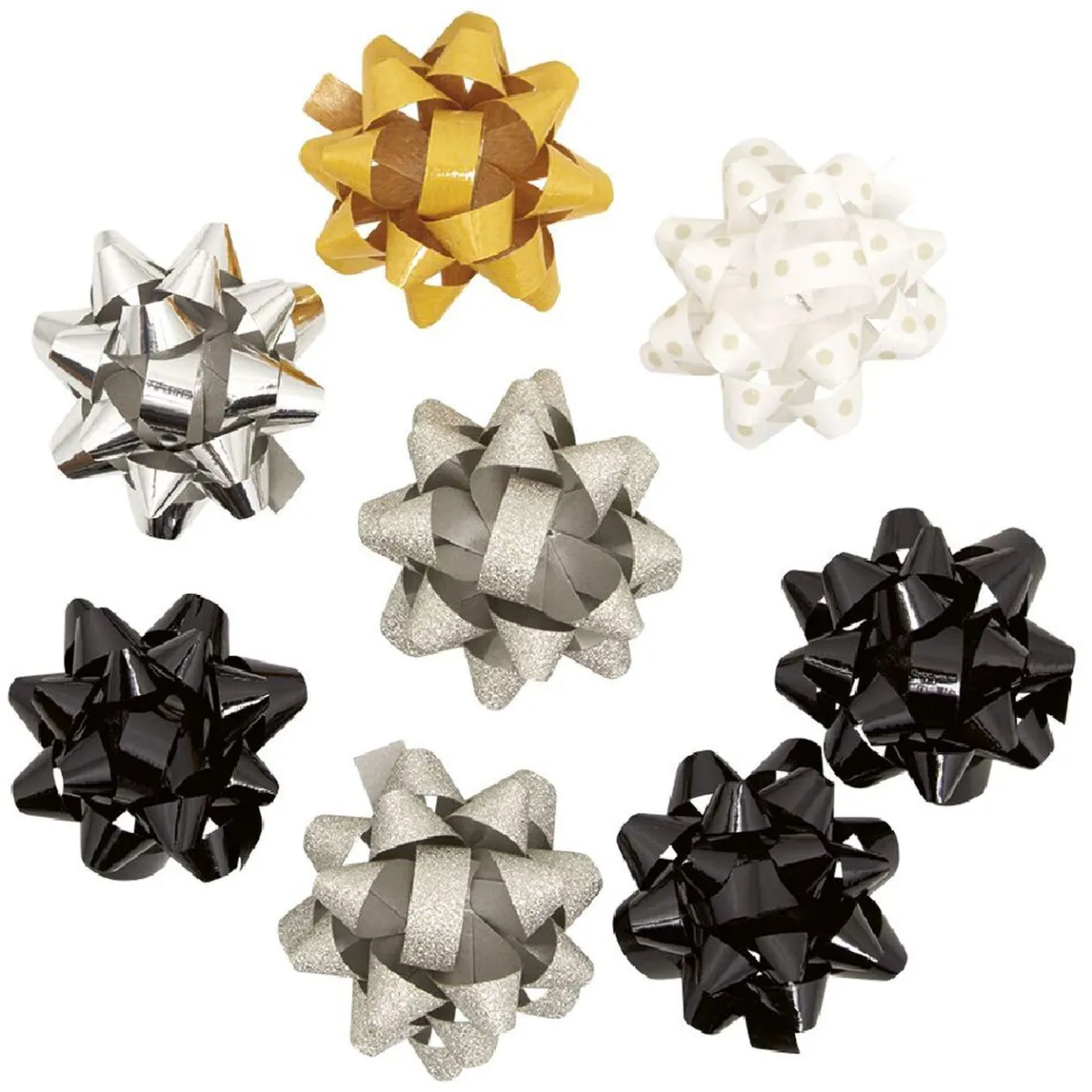 Ensemble de 8 noeuds pour décorer vos cadeaux de Noël dont 2 dorés, 2 gris, 2 noirs,1 blanc et 1 argenté.