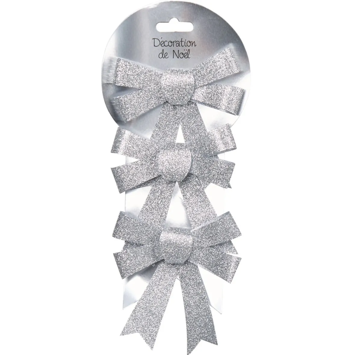 Lot de 3 noeuds gris pailletés à suspendre sur votre sapin de Noël pour une décoration festive et tout en magie.