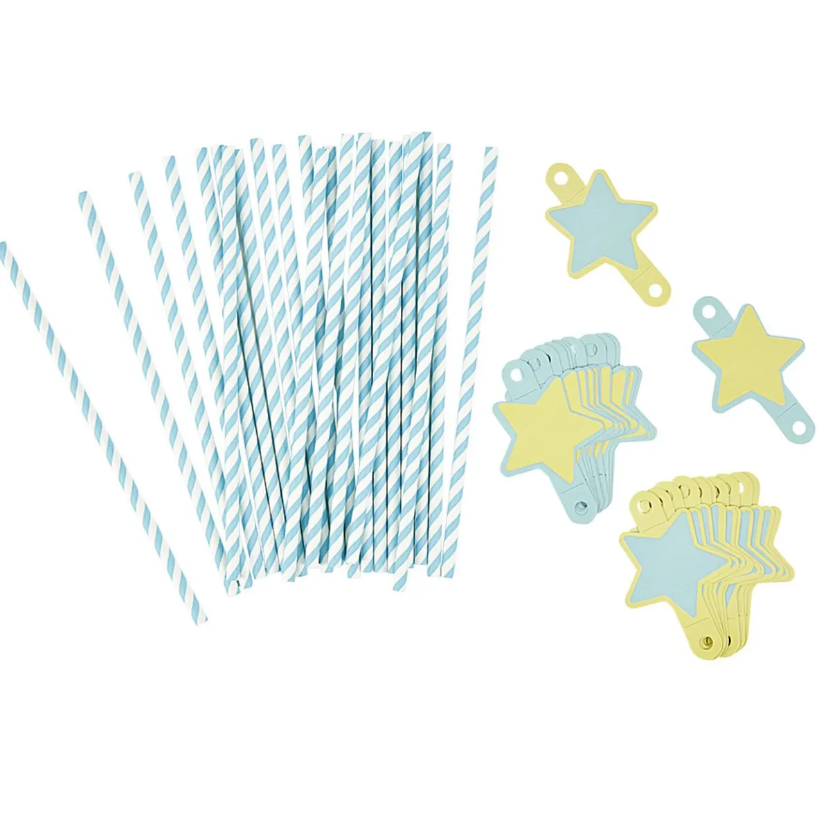 Ne vous trompez plus en prenant le verre de votre voisin grâce à ces pailles bleu et blanche et leurs étiquettes en forme d’étoile bleu et jaune.