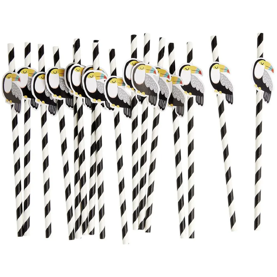 Apportez un brin d’originalité aux boissons que vous servez avec ce lot de 16 pailles en papier motif spirale colorée avec pièce décor sur le haut (toucan, citron, feuille ou fleur).