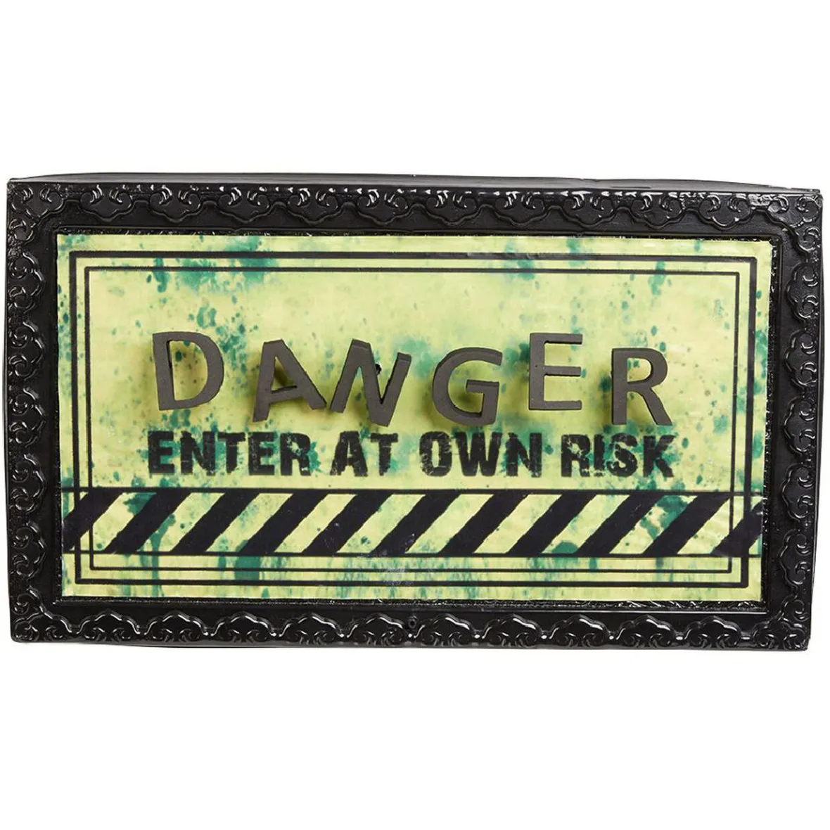 Une pancarte animée danger enter at own risk en plastique à poser pour Halloween.<b