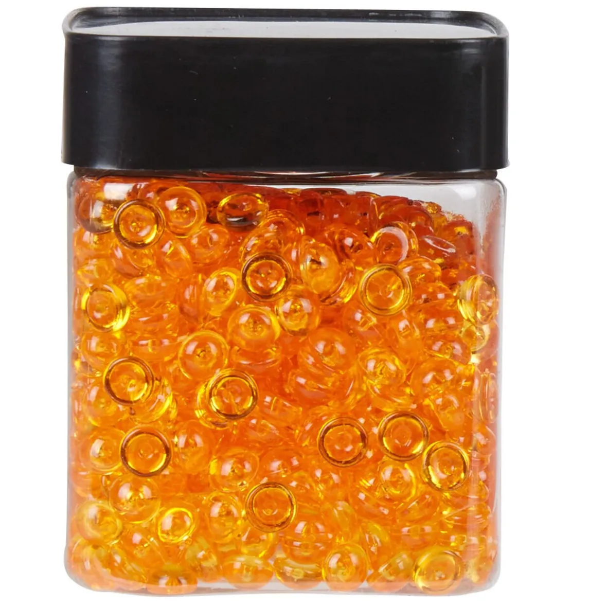 Boîte de perles plates décoratives oranges, cont. 130 gr, ø 0.5 cm environ, plastique.