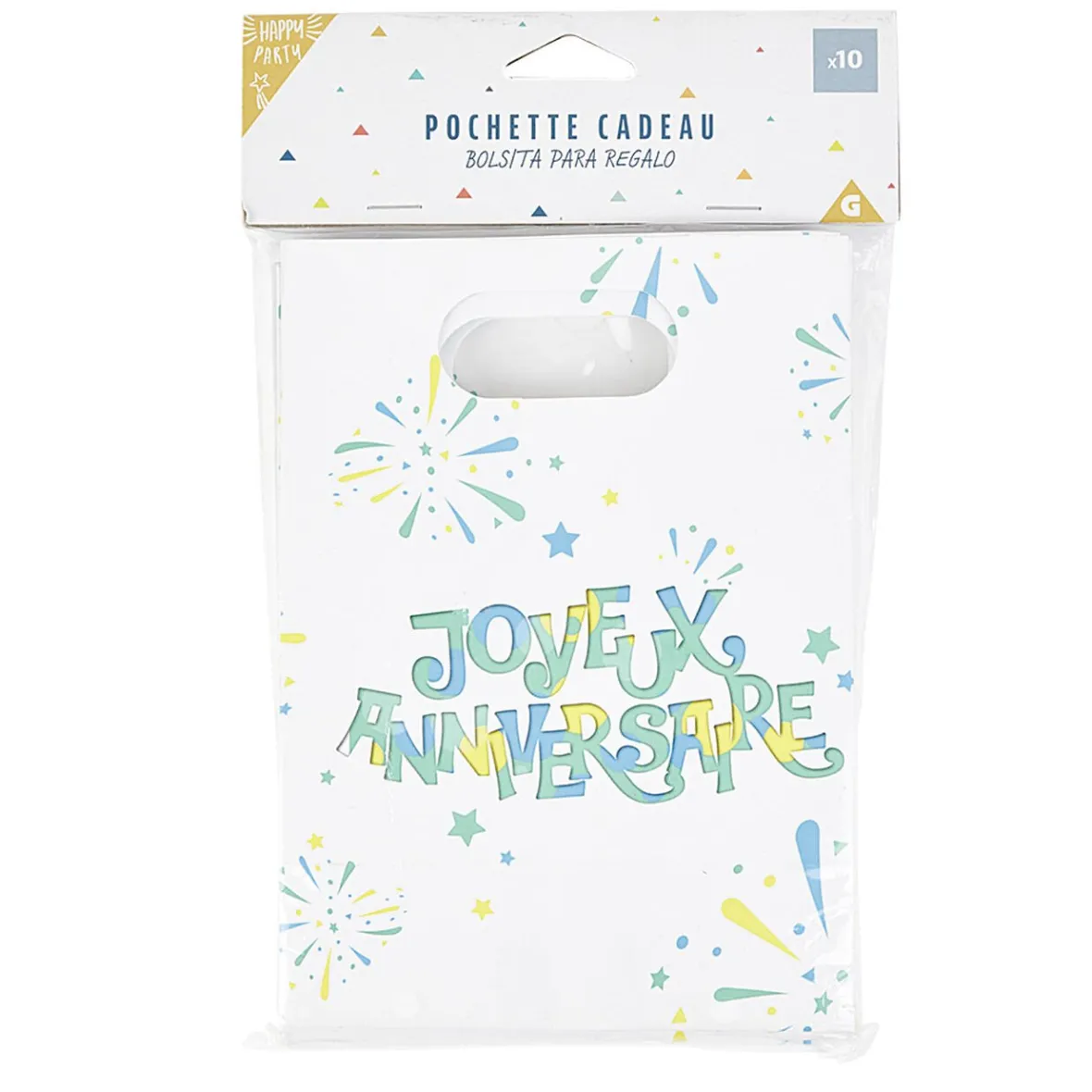 Si vous avez organisé un goûter d’anniversaire pour votre enfant et que vous souhaitez donner à ses copains quelques bonbons et souvenirs de ce joyeux après-midi, alors choisissez les 10 pochettes cadeaux en papier à l’inscription « Joyeux anniversaire » et aux feux d’artifice vert, bleu et jaune.