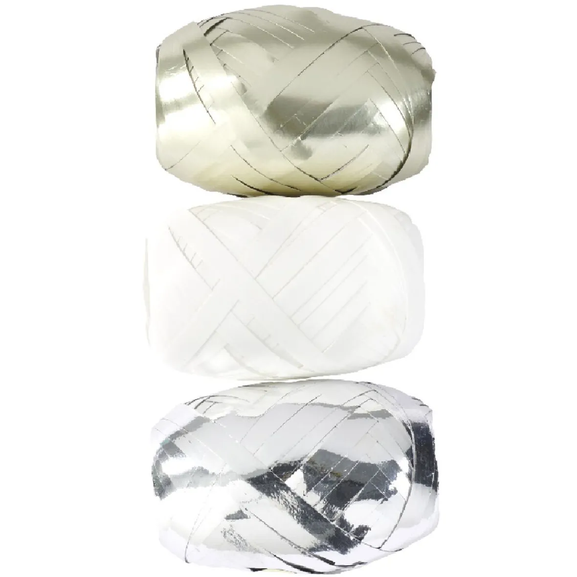 Pour Noël, ne passez pas à côté de ce lot de bolducs composé de 3 rubans (doré, blanc et argenté) qui saura agrémenter avec élégance vos emballages cadeaux.