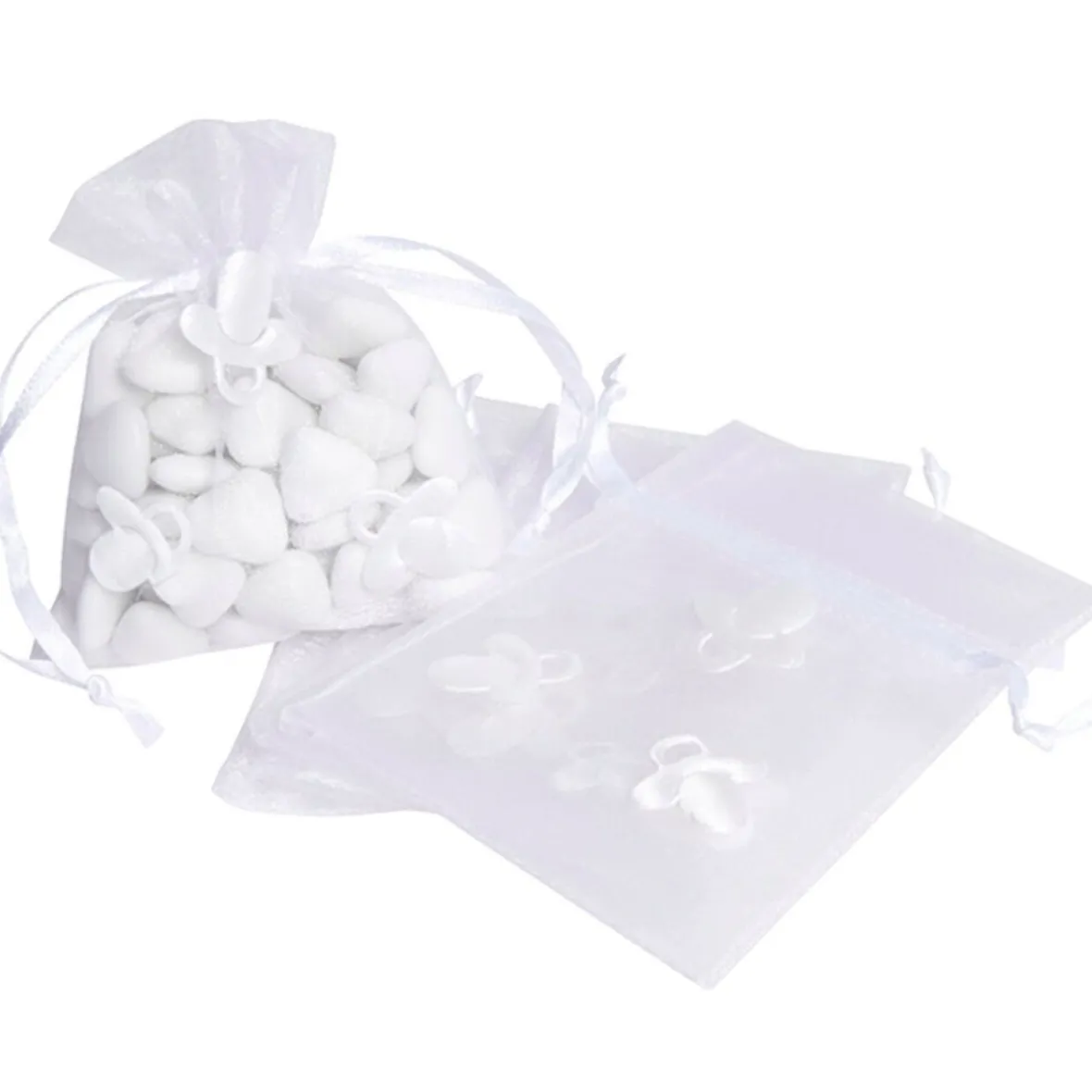 6 sacs à dragées blanc design tétine en organza, dim. 10,5×8 cm. Contenant à dragées idéal pour baptême ou autre évènement. Vendu sans dragées.