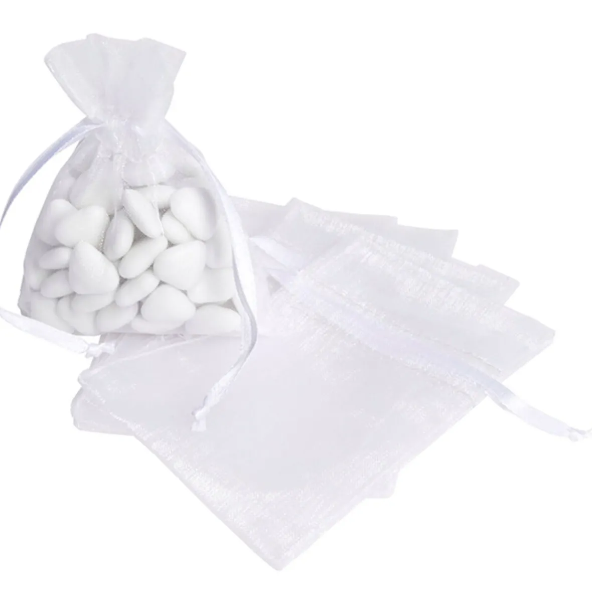 5 sacs à dragées blancs en organza et polyamide, dim. 8×10 cm. Contenant à dragées idéal pour votre mariage ou autre évènement. Vendu sans dragées.