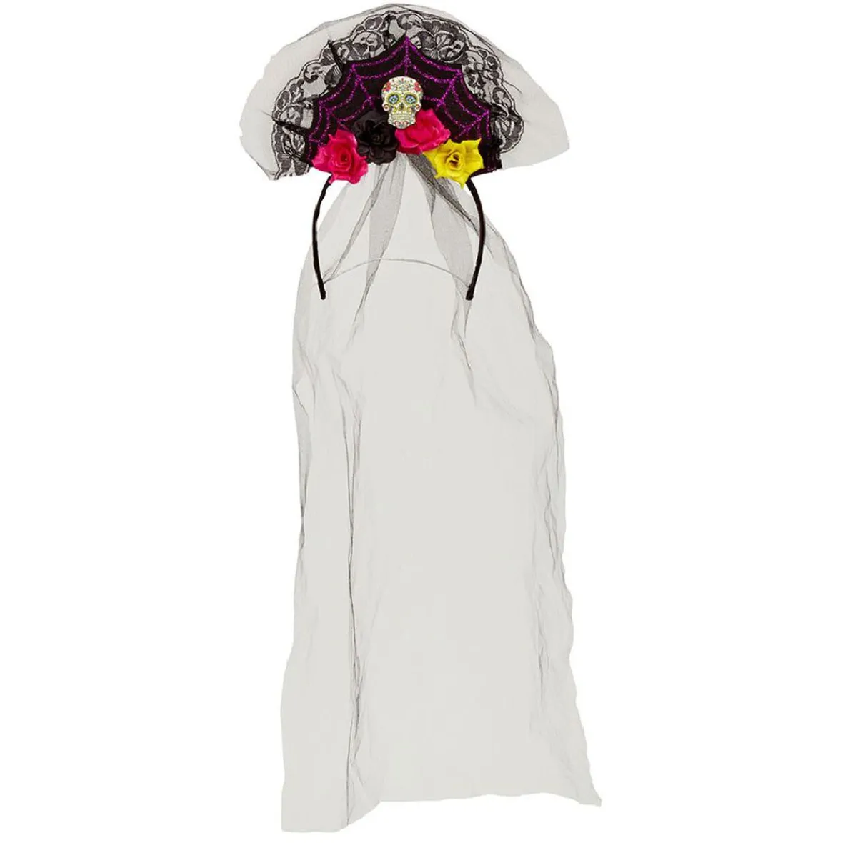 Un serre tête squelette comportant un voile noir et 3 roses colorées.