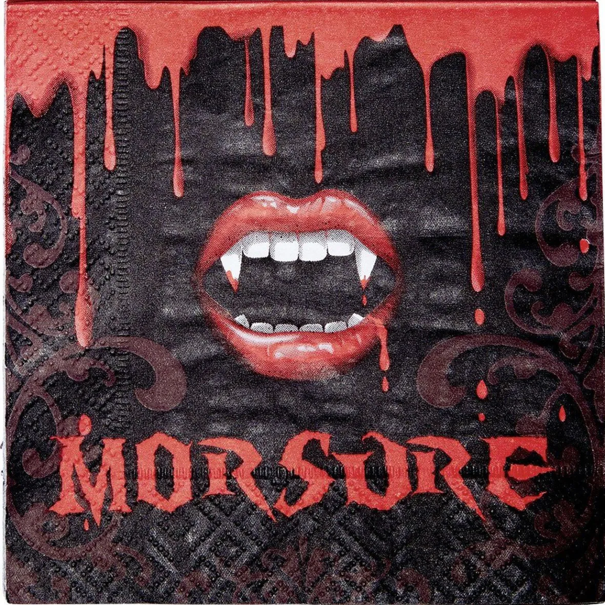 Lot de 20 serviettes en papier, noires et rouges avec inscription Morsure et motifs bouche de vampire avec sang dégoulinant.