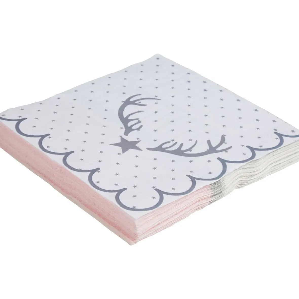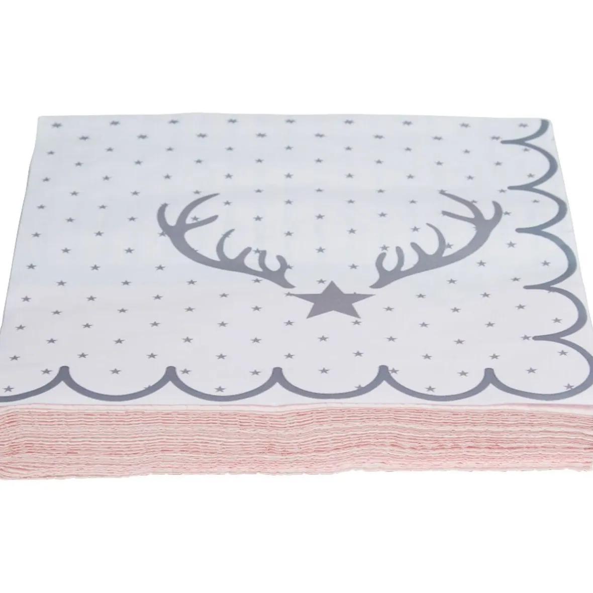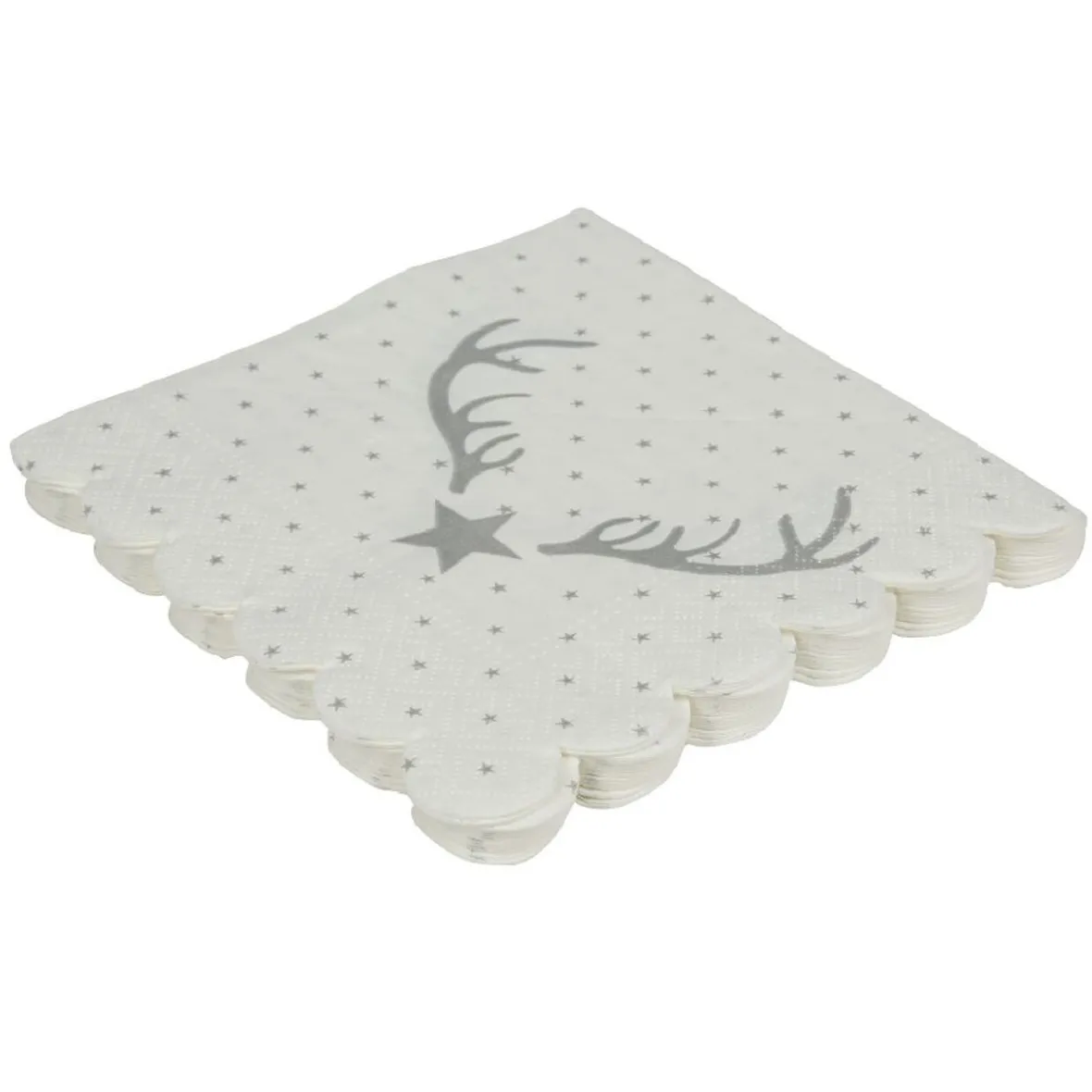 Lot de 12 serviettes dentelées en papier blanc ponctué d’étoiles argentées avec détail renne de Noël, un élément pratique et original qui fera mouche sur votre table de réveillon.