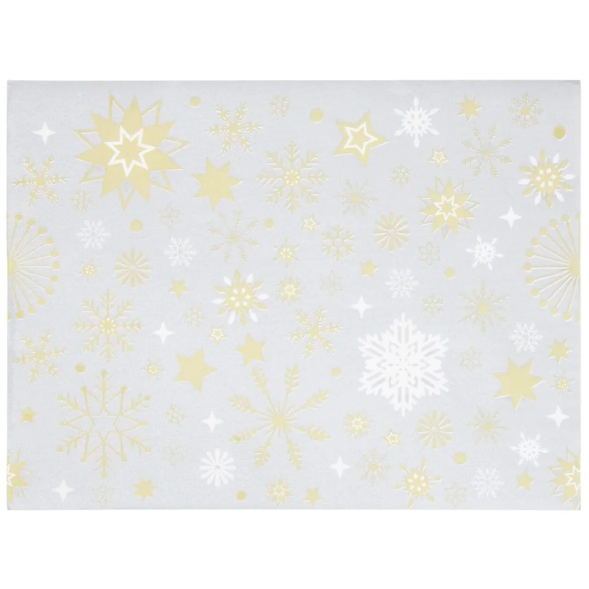 Set de table rectangulaire en papier Airlaid gris à motif flocons dorés. Résistant, absorbant et reutilisable, idéal pour créer une décoration de table à la fois festive et élégante.