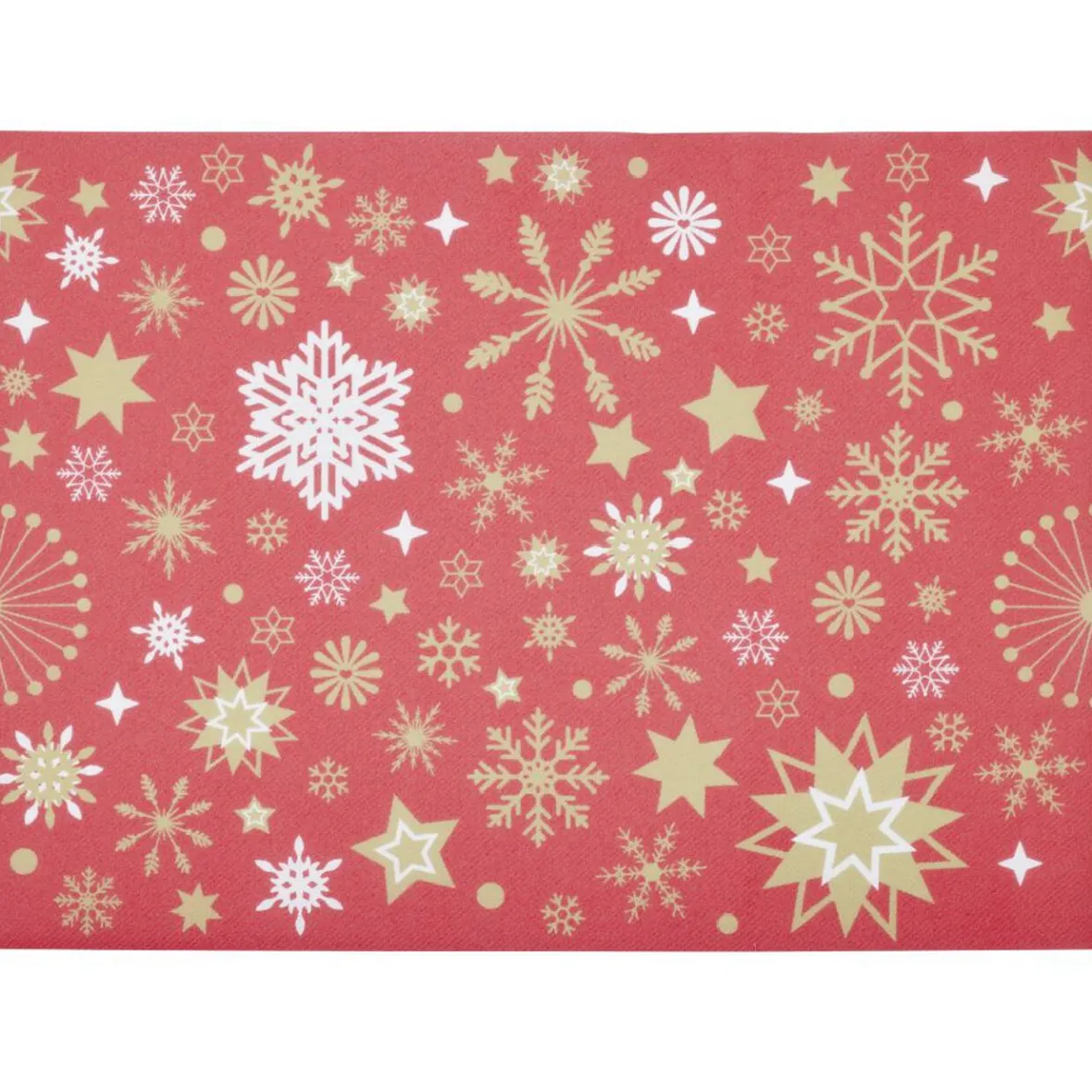 Set de table rectangulaire en papier Airlaid rouge à motif flocons dorés. Résistant, absorbant et reutilisable, idéal pour créer une décoration de table à la fois festive et élégante.