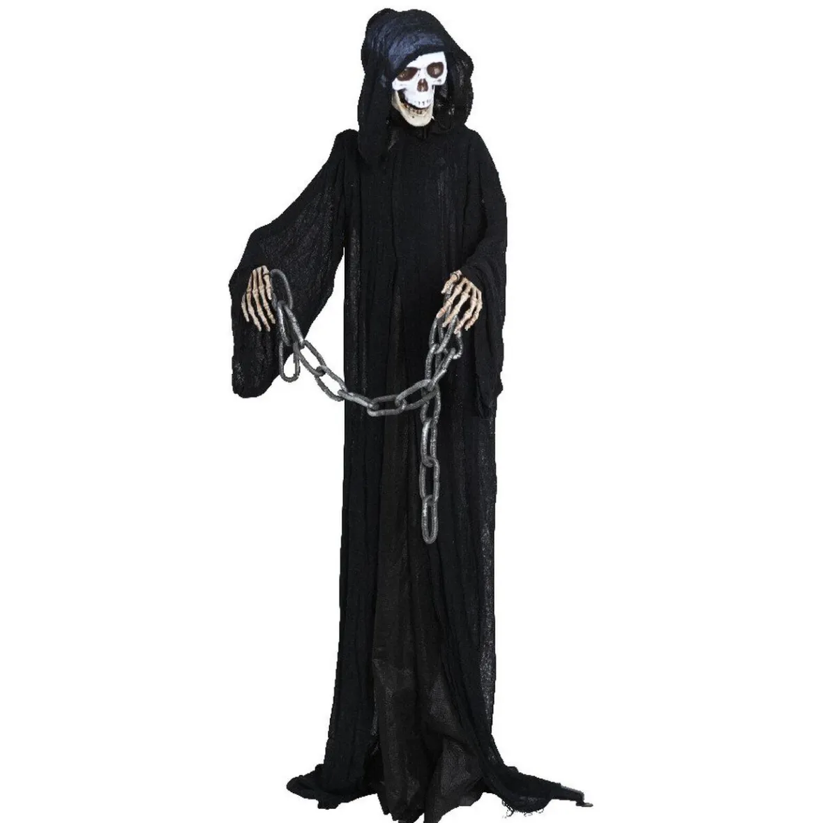 Squelette animé, crâne lumineux, son et mouvement, h. 175 cm, polyester.