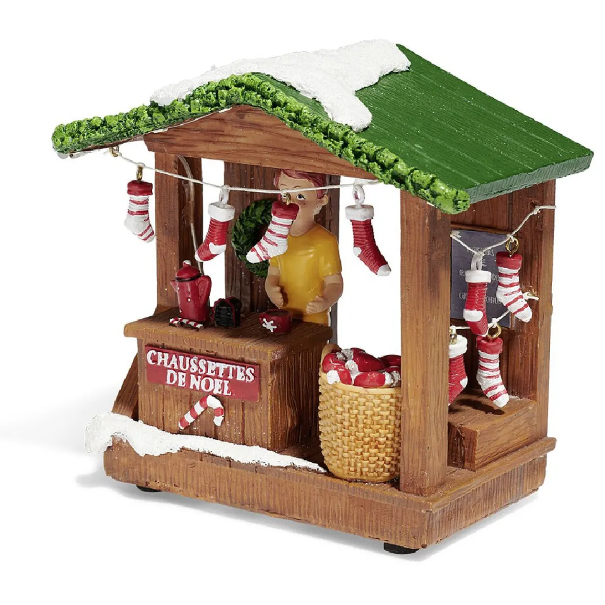 Cette décoration lumineuse munie de 5 LEDs blanc chaud représente un stand de chaussettes de Noël avec un vendeur.