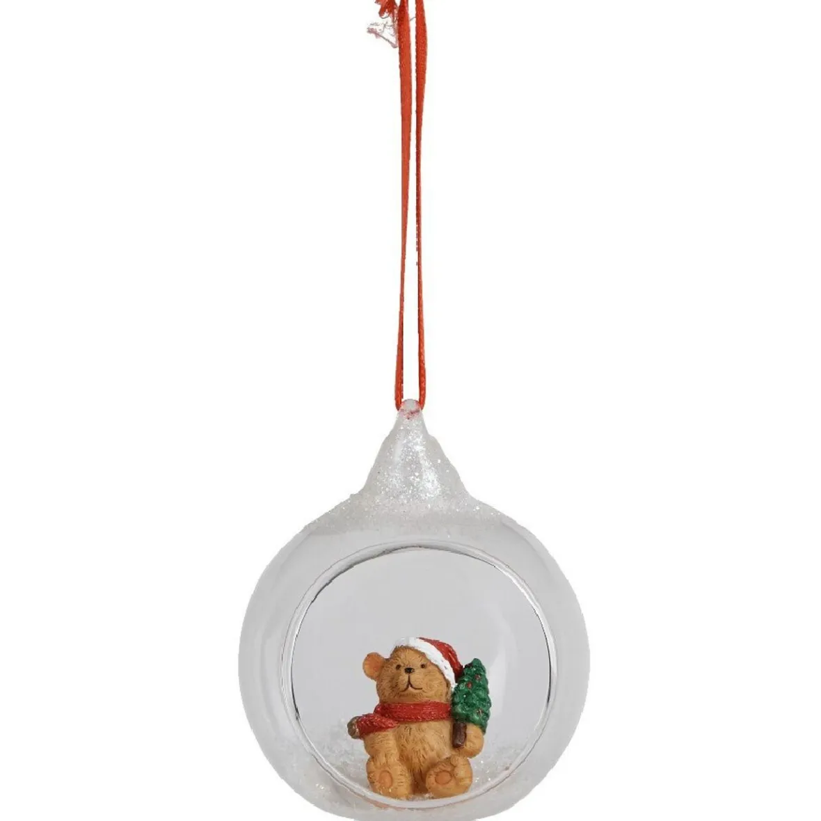 Boule de Noël ouverte en verre avec personnage déco dans le thème Noël traditionnel.