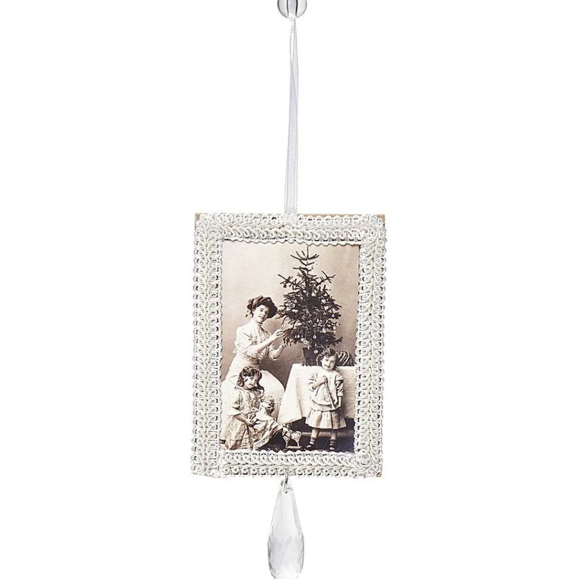 Suspension de Noël en forme de cadre photo rétro, de couleur blanche avec une pampille transparente.