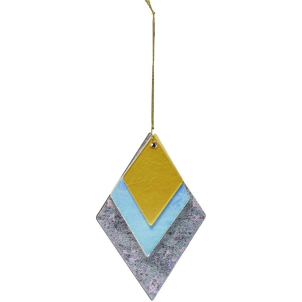 Suspension de Noël en bois couleur argent, jaune et bleue et de forme géométrique.