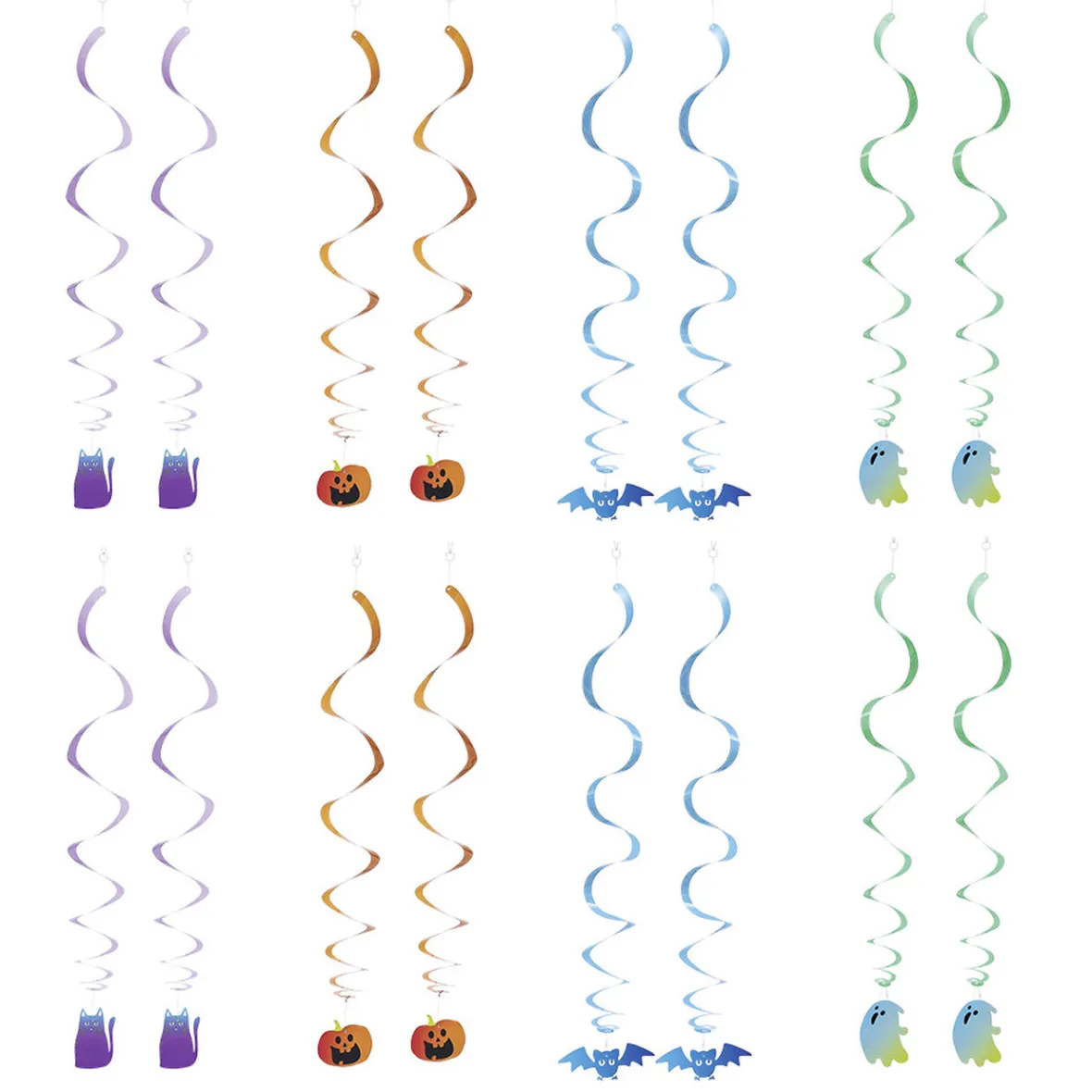 Ces 8 suspensions multicolores en papier représentant fantômes, chauve-souris, citrouilles et chats sont idéales pour compléter votre décoration d’Halloween.