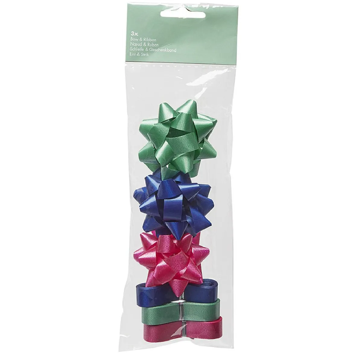Finalisez vos emballages cadeaux avec ce lot de 3 noeuds et 3 rubans de couleurs rose, vert et bleu.