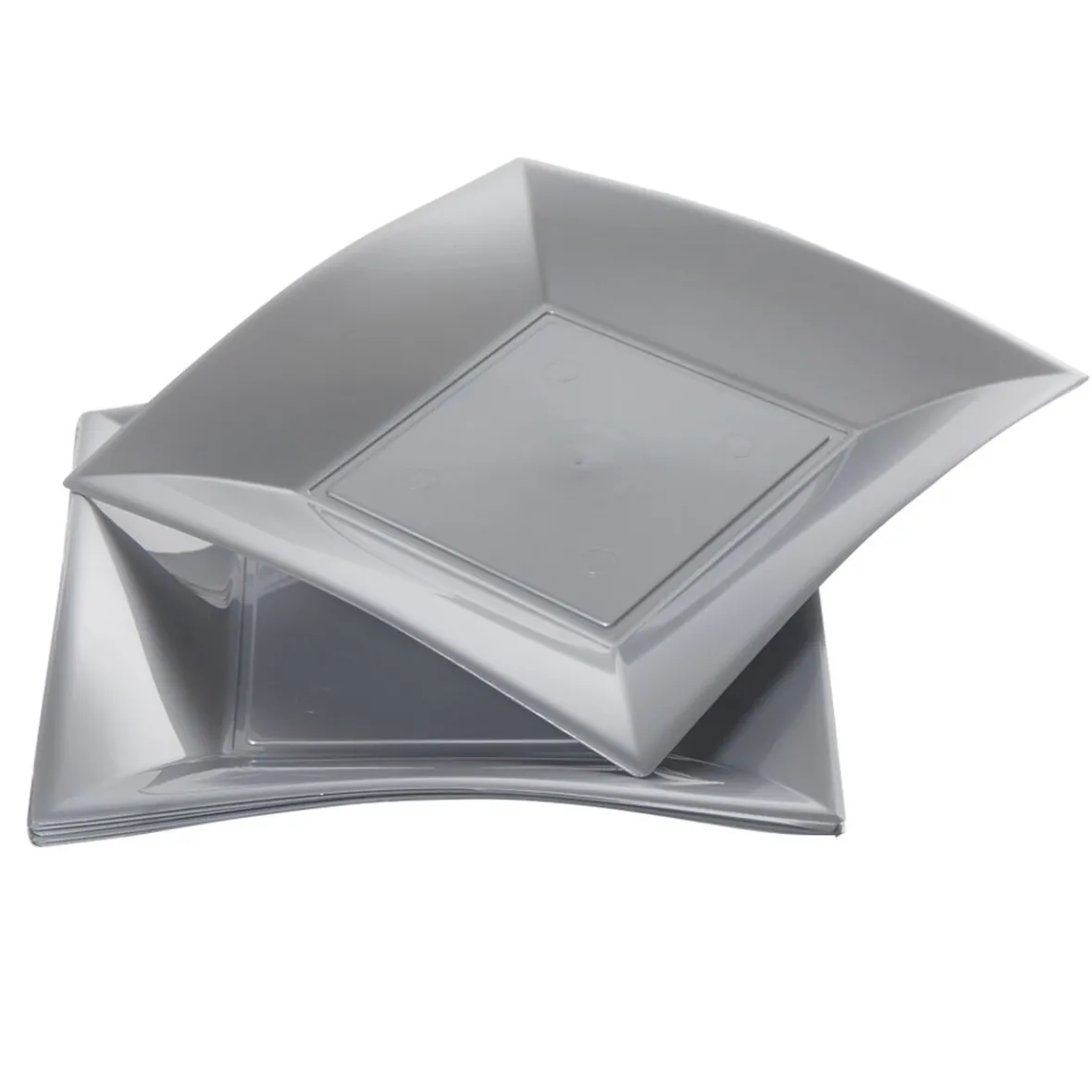Lot de 6 assiettes jetables carrées à bord incurvé en plastique de couleur gris argenté.