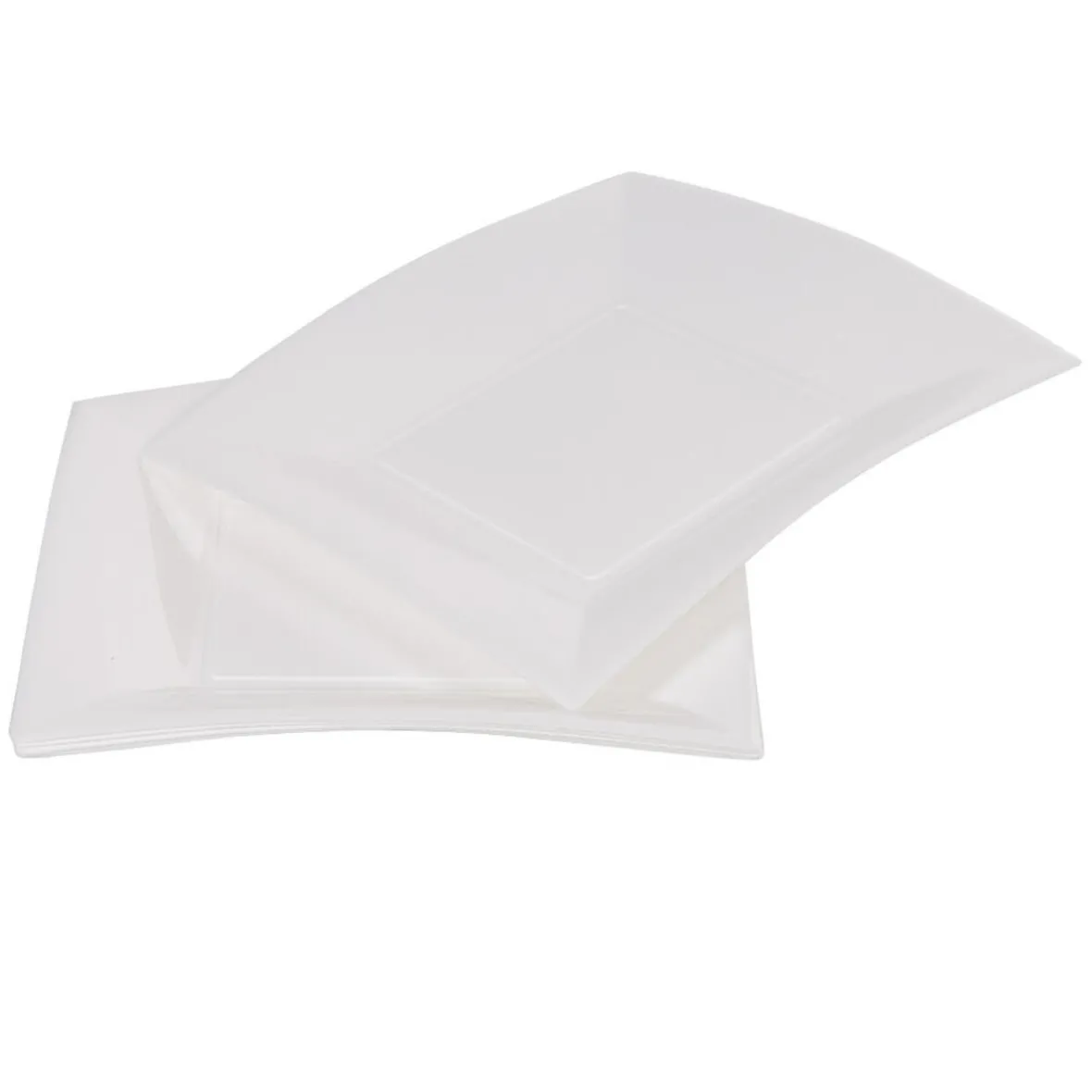 Lot de 6 assiettes jetables carrées à bord incurvé en plastique de couleur blanc nacré.
