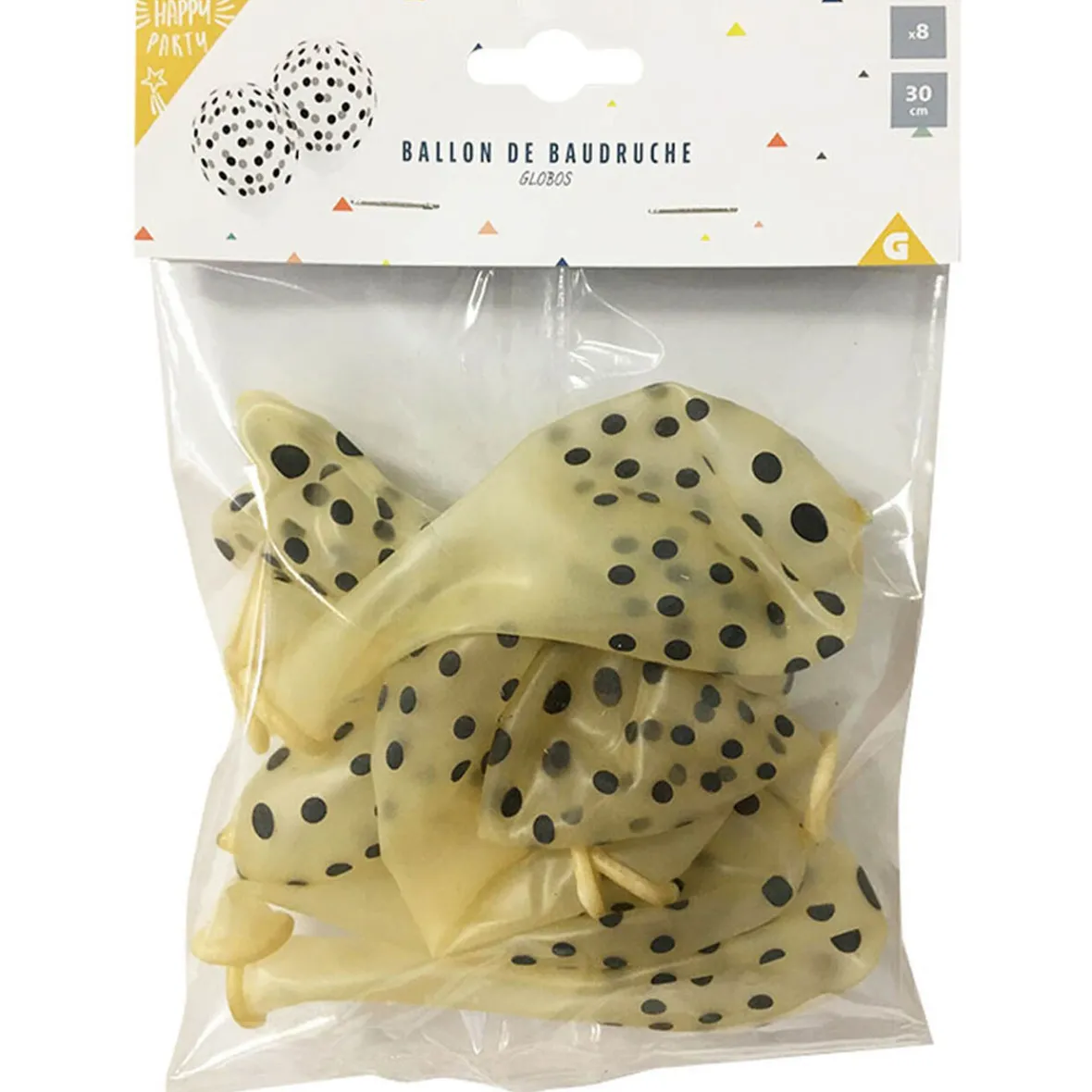 Lot de 8 ballons de baudruche blancs motifs pois gris et noirs. Idéal pour organiser un évènement festif !