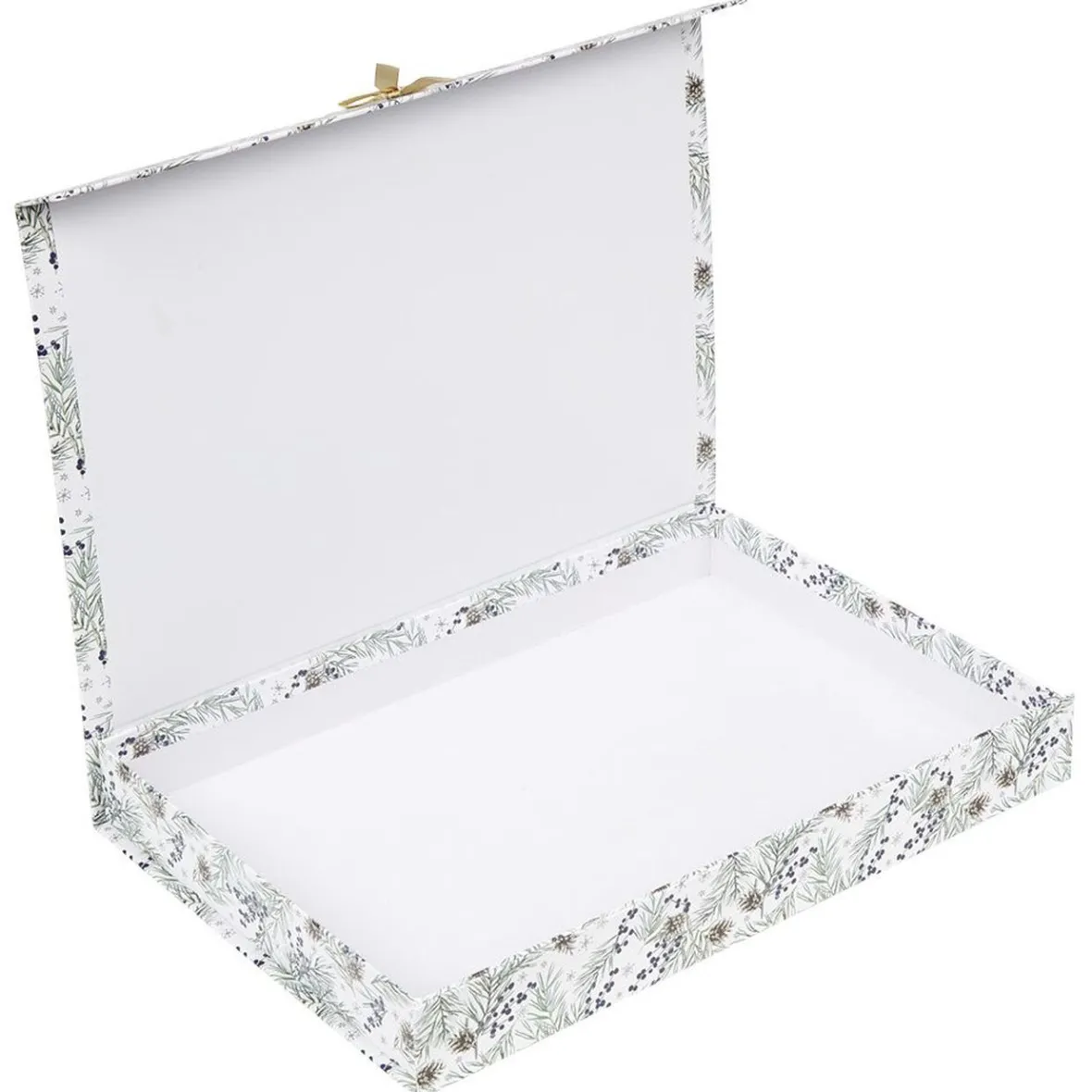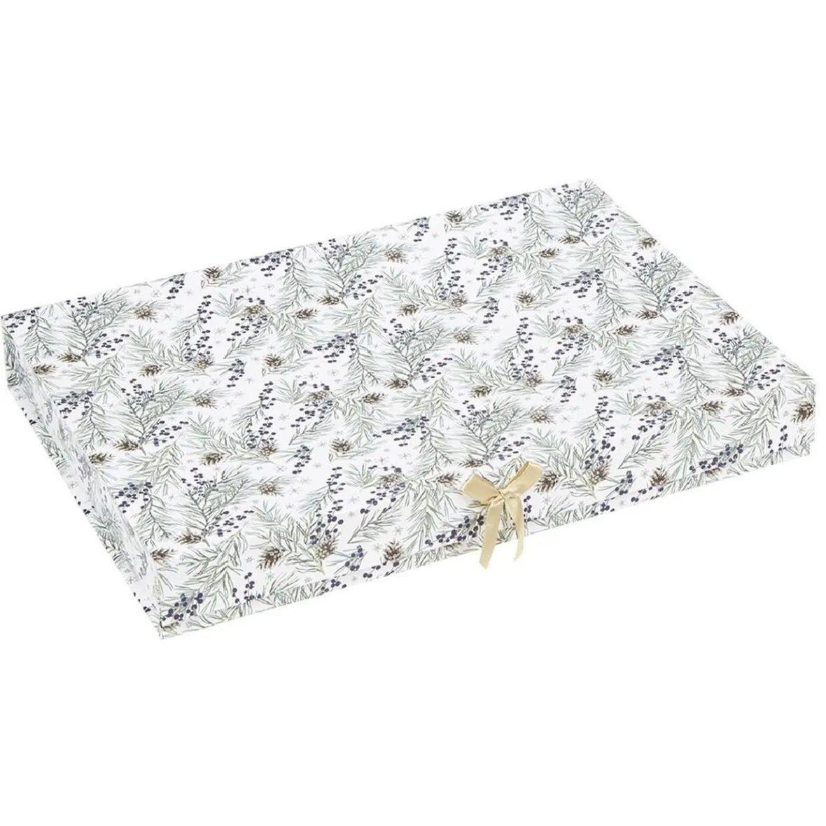 Boîte à cadeau de Noël blanche avec des motifs style jardin d’Hiver agrémenté d’un petit noeud jaune.