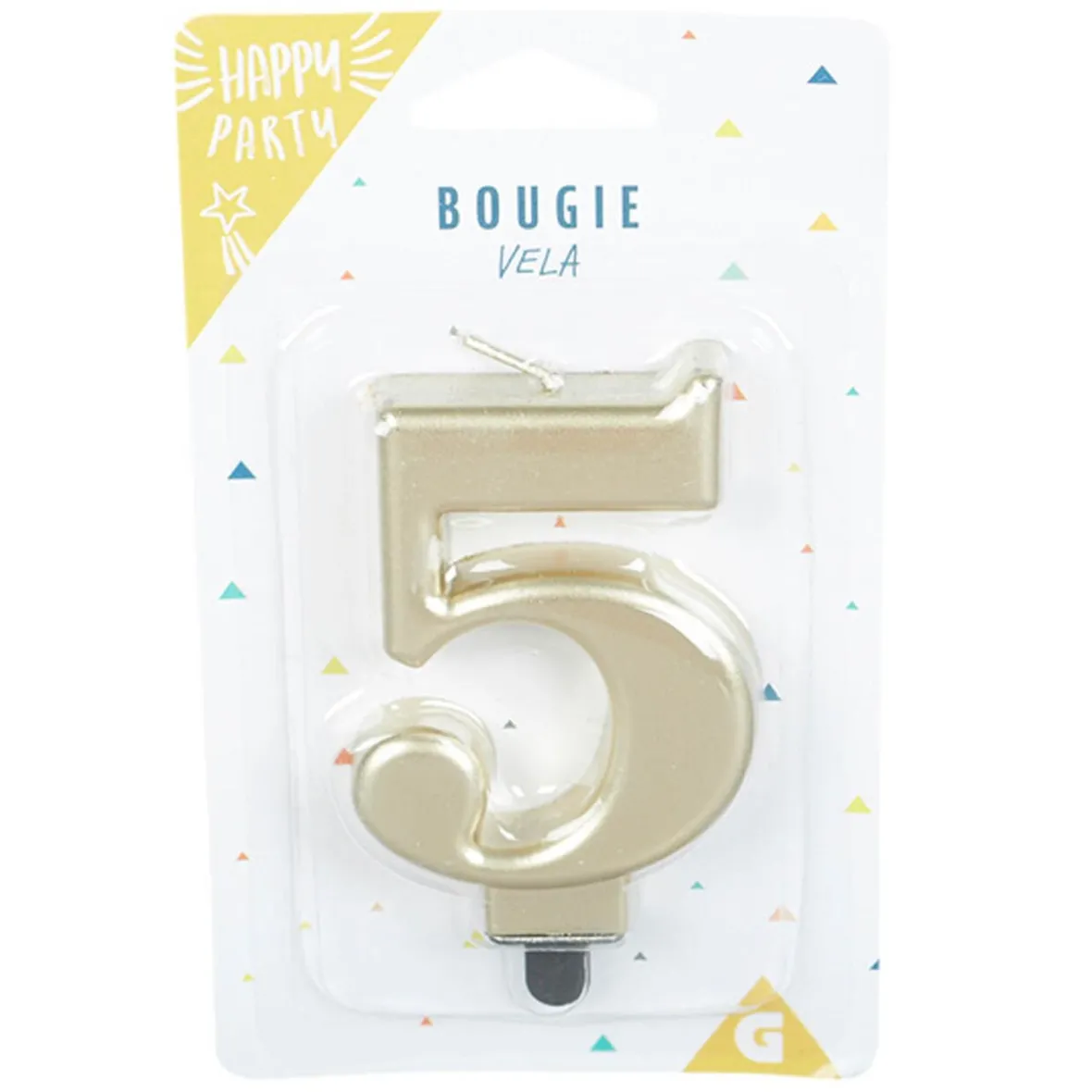 Bougie d’anniversaire, chiffre cinq de couleur mate dorée.