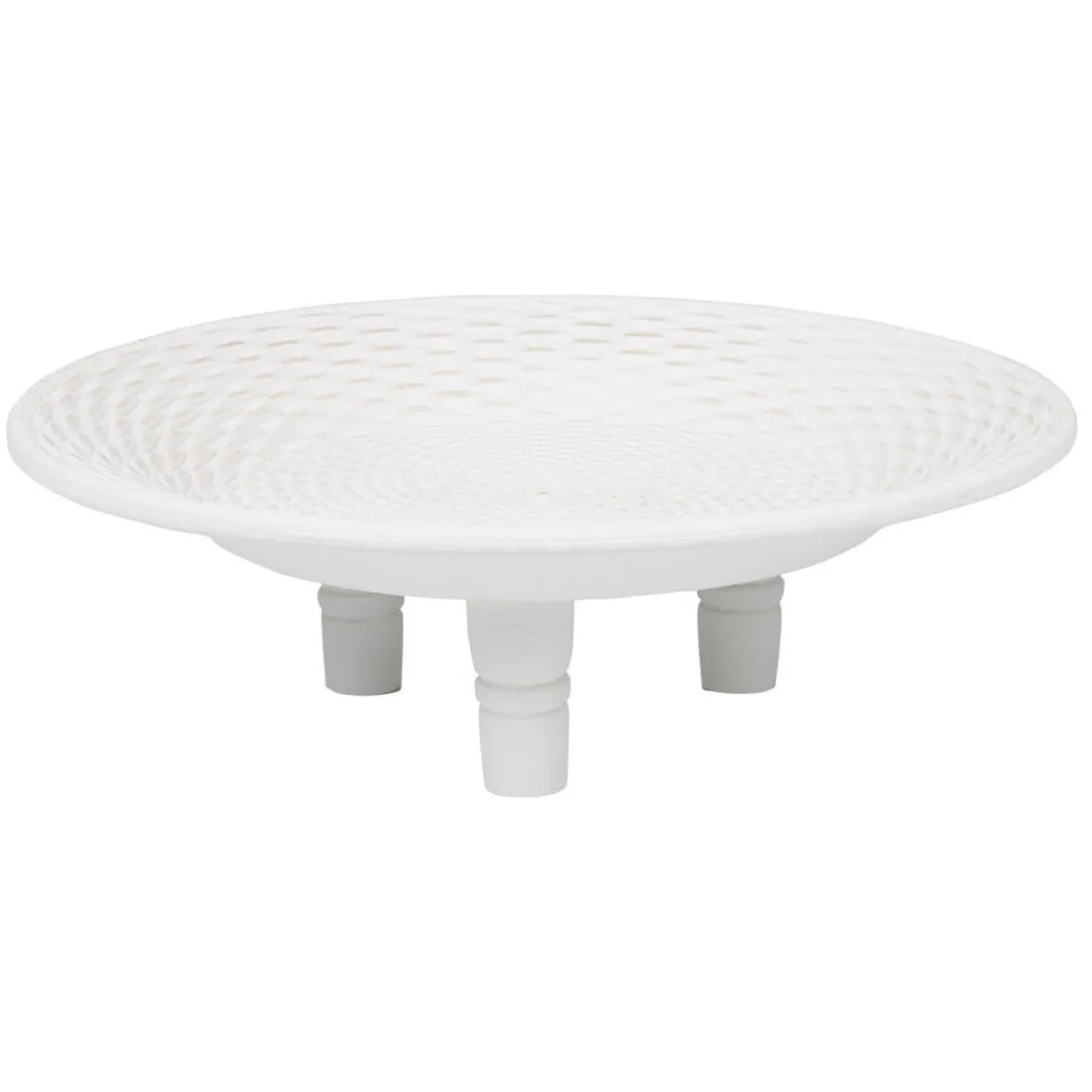 Plat rond en mdf sculpté blanc et surélevé sur 3 pieds, idéal pour la décoration de votre centre de table.