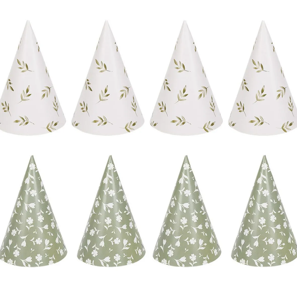 Comprend 4 chapeaux blanc à motif feuillage vert sauge et 4 chapeaux vert sauge à imprimé floral blanc.