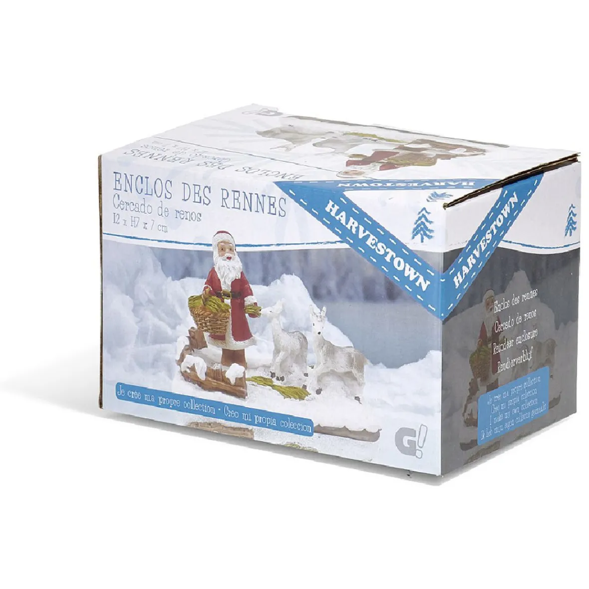 Enclos à rennes avec Père Noël leur donnant à manger, le tout en résine de couleur blanche et rouge.