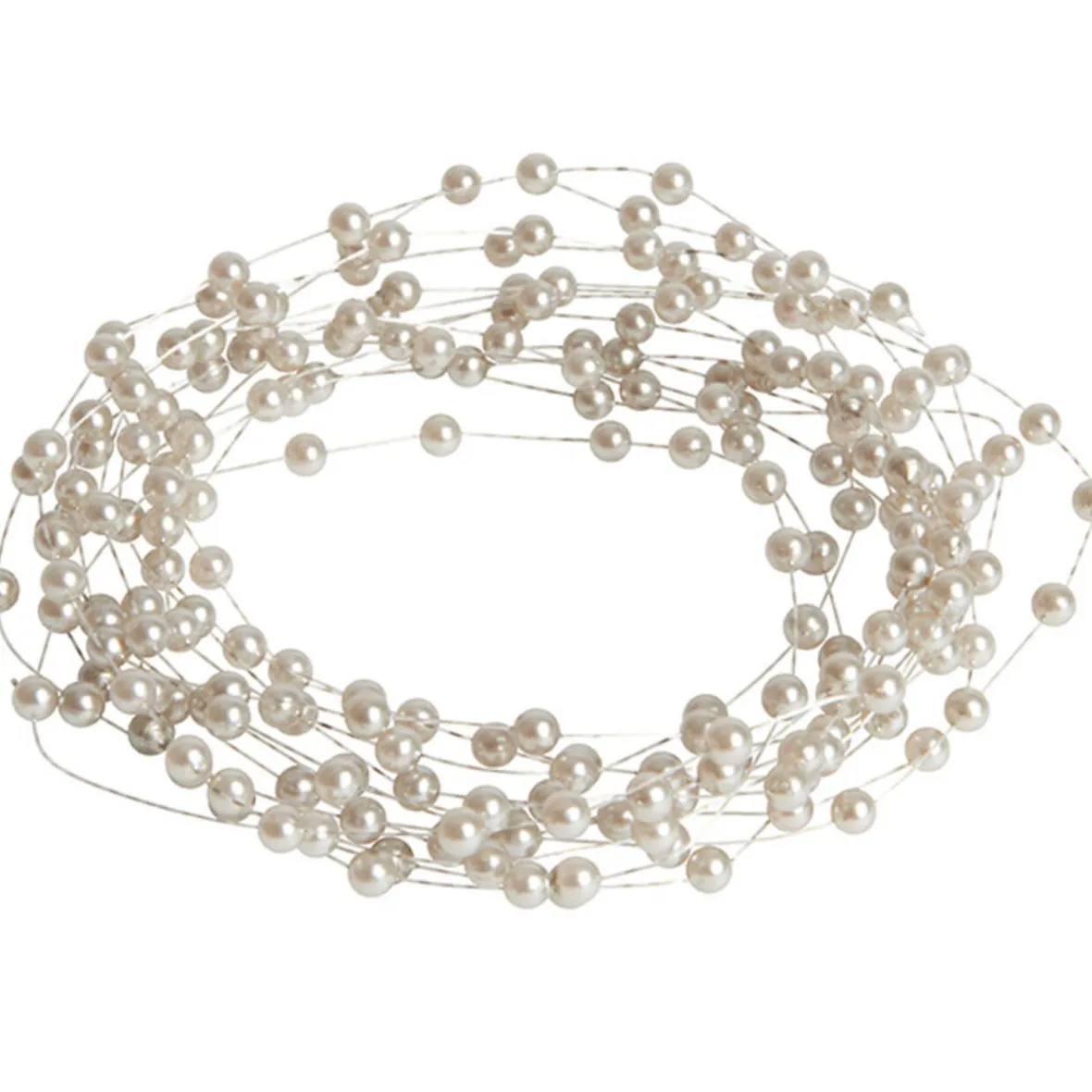 Guirlande de perles argentées L. 3 m, plastique. Peut s’utiliser en décoration pour mariage ou autre évènement.
