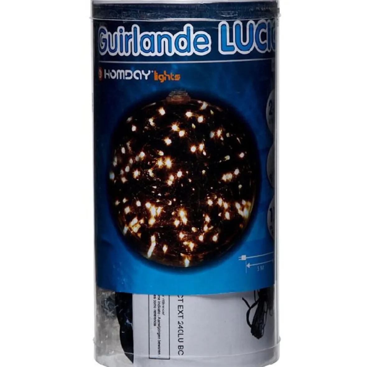 L. 14,56 m, 240 lucioles, 10 m d’éclairage, 8 jeux de lumières, 230 V, 50 Hz, fonctionne sur secteur.Tous les objets de décoration sont chez GIFI..