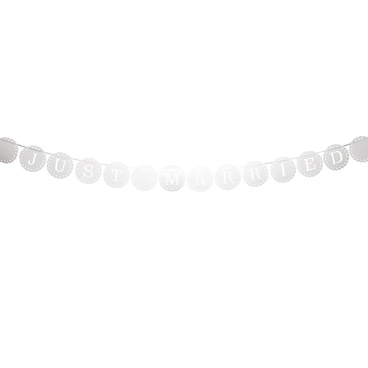 Guirlande « Just married », dim. Ø 22 x L. 350 cm, papier, polyester et satin. Idéal pour la décoration de salle de votre mariage.