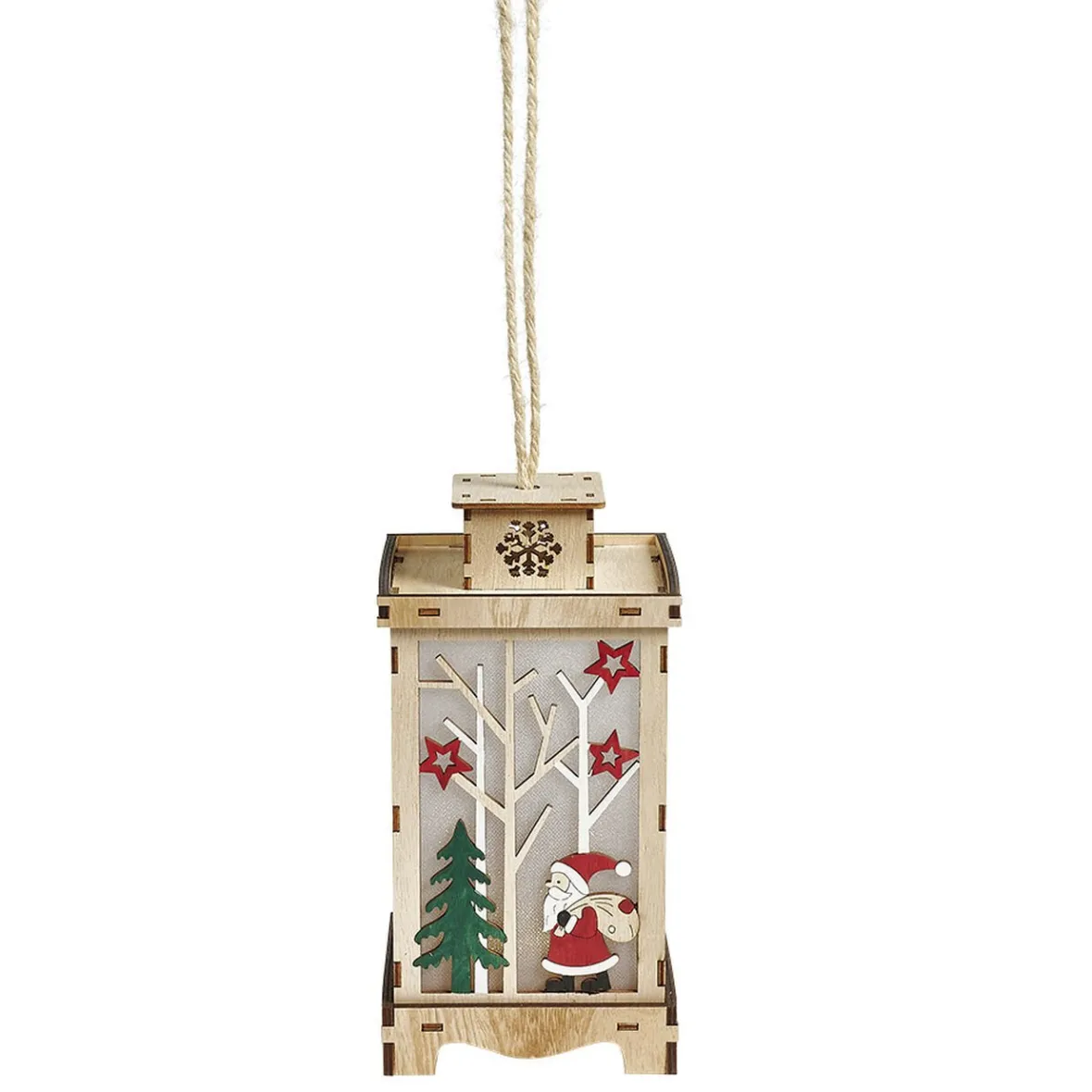 Lanterne lumineuse en bois décoré de motifs Noël pour égayer votre intérieur durant les fêtes de fin d’année.
