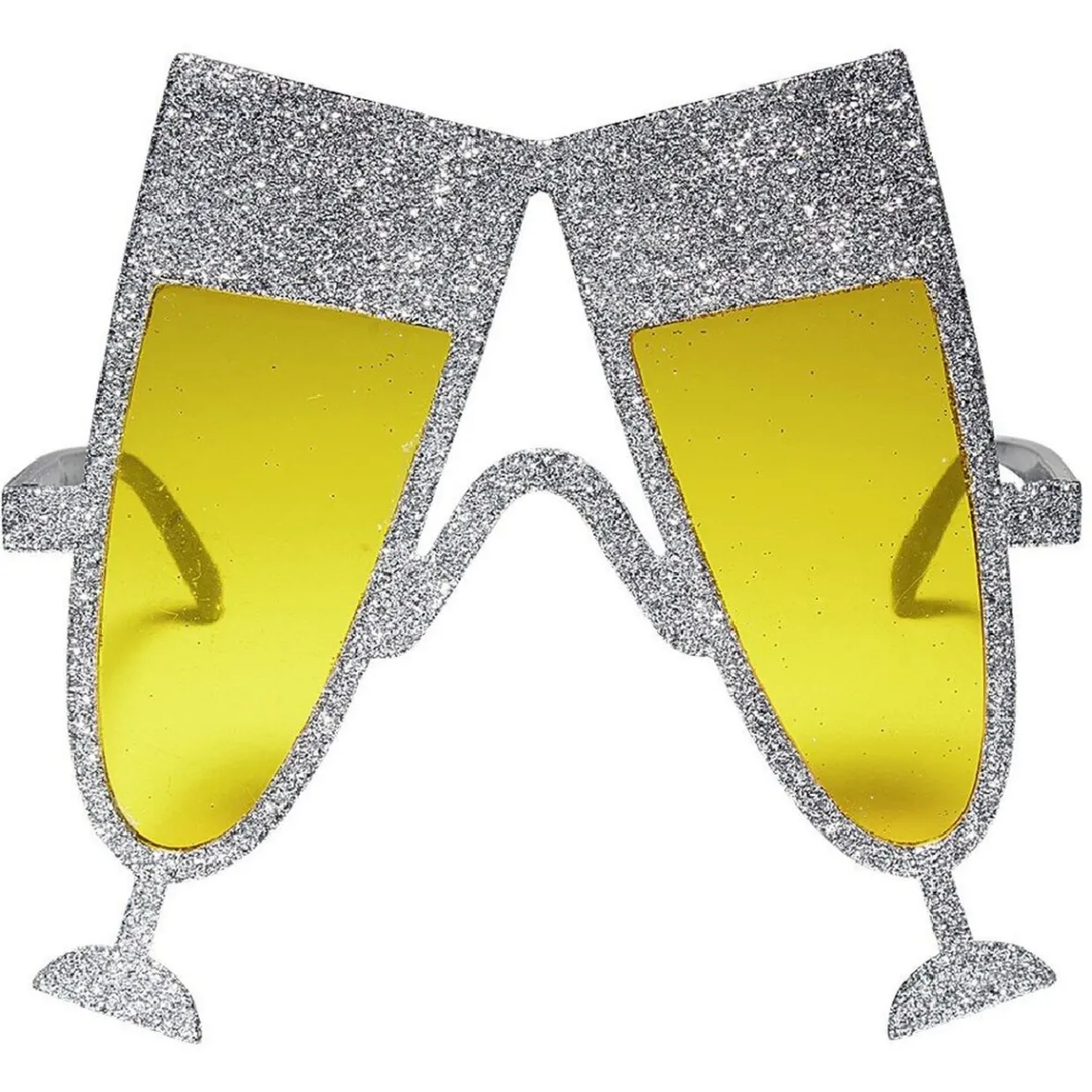 Pour un regard pétillant, il n’y a rien de mieux que cette paire de lunettes en forme de flûte jaune et argentée.