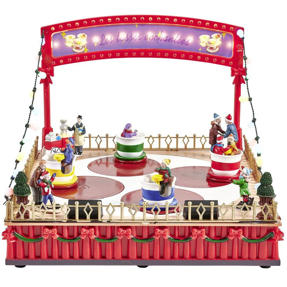 Scène représentant l’attraction des tasses à thé dans une fête foraine avec des enfants et leurs parents qui s’amusent.