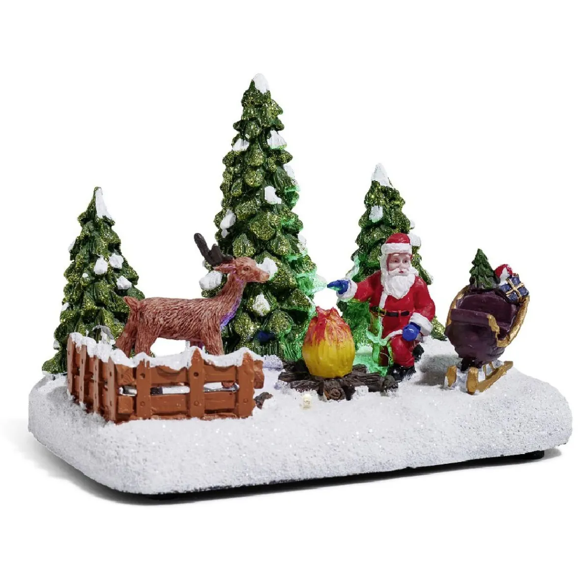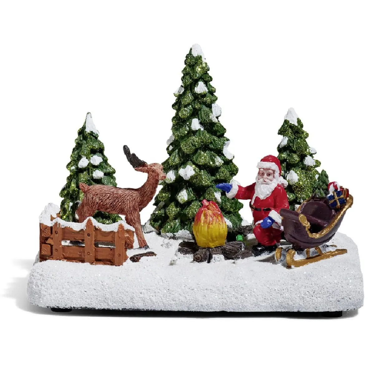 Père Noël et renne lumineux au bord d’un feu de bois sur la neige.
