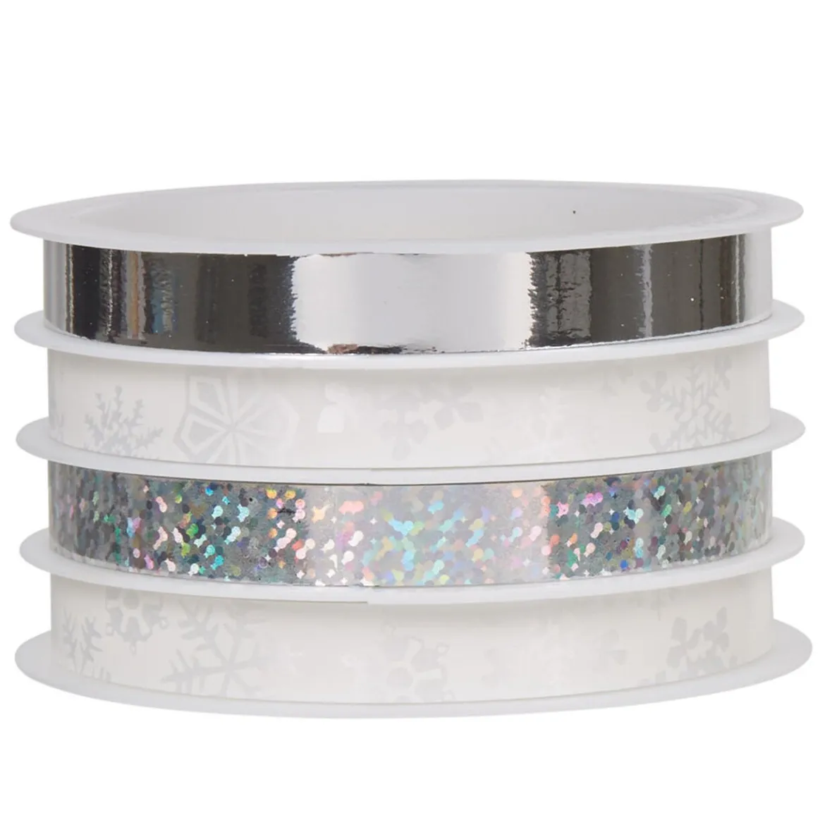 4 rubans d’emballage pour papier cadeau de couleur blanc et argenté.