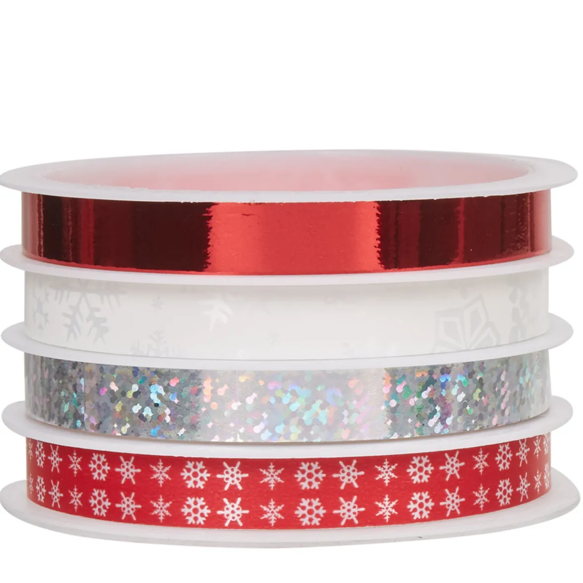 4 rubans d’emballage pour papier cadeau de couleur rouge, blanc et argenté.
