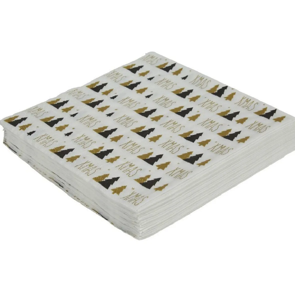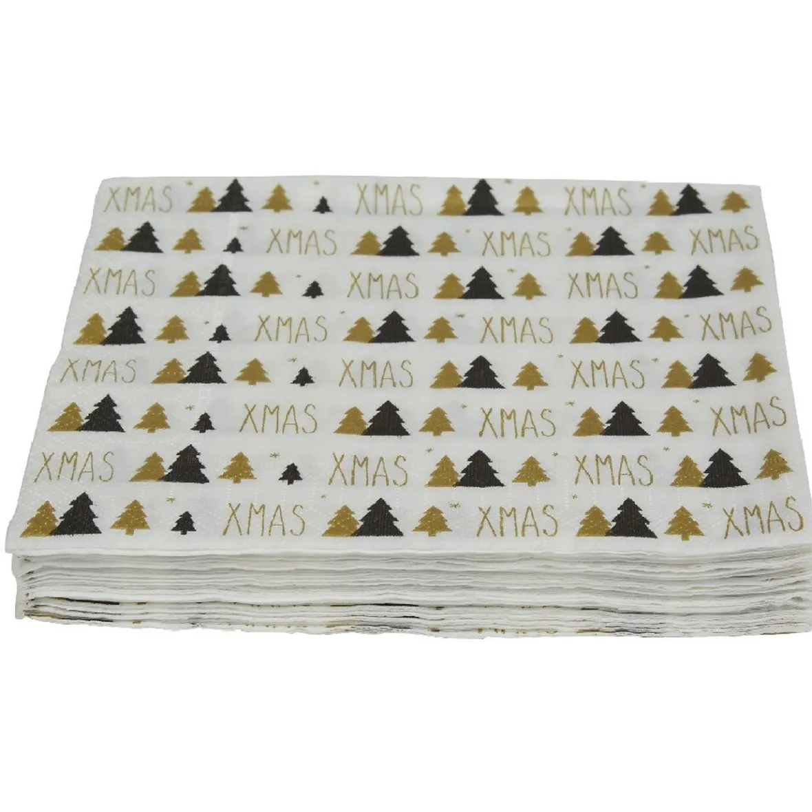 Lot de 20 serviettes jetables en papier noir imprimé « XMAS » et de motifs sapins blancs et dorés.