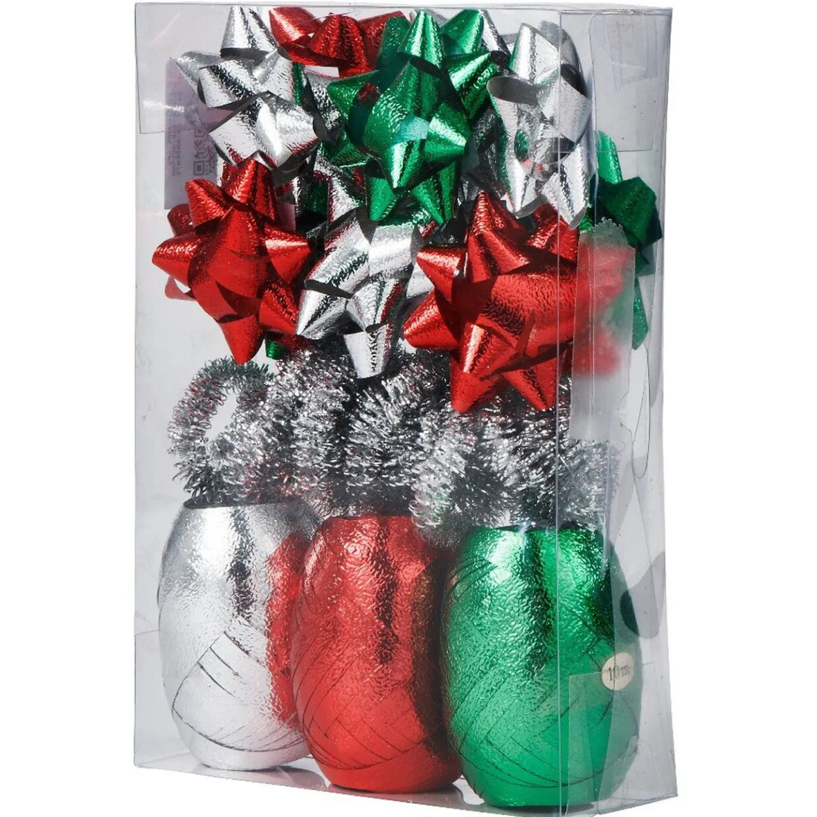 Set de 12 noeuds et 4 rubans pour emballage cadeau de couleur vert, rouge et argenté.
