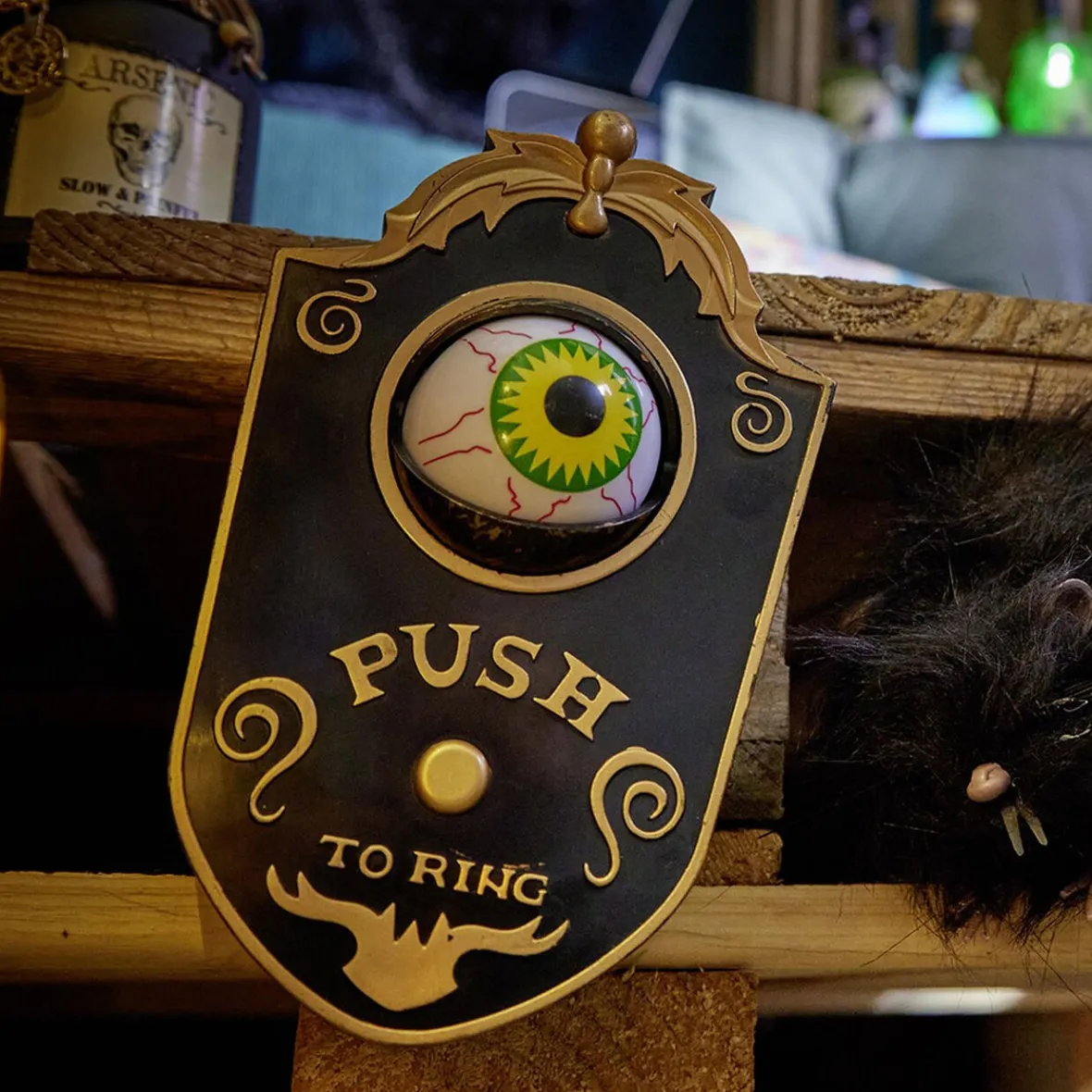 Sonnette noire inscription « Push to ring » avec oeil électrique qui bouge.