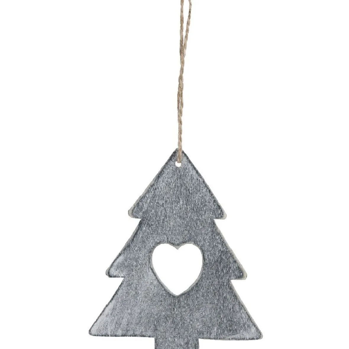 Suspension en forme de sapin gris cérusé ajouré d’un motif coeur, idéal pour donner un esprit nature et scandinave à votre décoration de Noël.